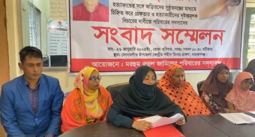 সংবাদ সম্মেলনে উপস্থিত ছিলেন নিহত রুহুল জামিলের মা রওশন বানু, স্ত্রী সালমা আক্তার নিঝুম, বড় মেয়ে ফৌজিয়া আফসানা ইনান, ছোট মেয়ে সারা জামিল সিফা, বোন দিলরুবা আক্তার, বিলকিস সুলতানা, ছোট ভাই রুহুল ইসলাম ও তার স্ত্রী সাম্মি আক্তার লিপি।