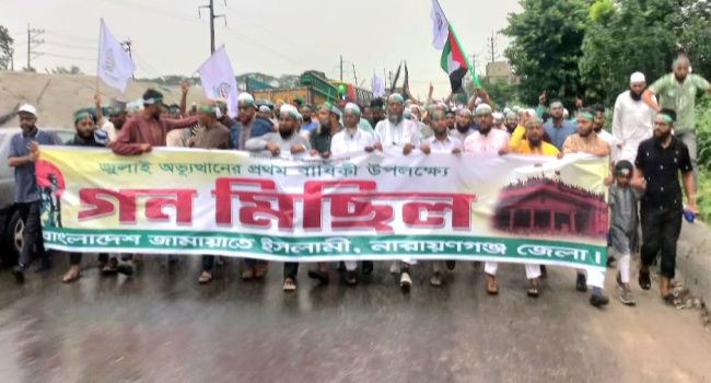 মঙ্গলবার (৫ আগস্ট) বিকেল সাড়ে ৫টায় সোনারগাঁ উপজেলার ঢাকা-সিলেট মহাসড়কের নিউ ঢাকা মোড় থেকে শুরু হয়ে কাঁচপুর সেতু পর্যন্ত একটি বিশাল গণমিছিল অনুষ্ঠিত হয়। এর আগে নিউ ঢাকা মোড়ে নারায়ণগঞ্জ জেলা জামায়াতের উদ্যোগে আয়োজিত সমাবেশে বক্তব্য রাখেন কেন্দ্রীয় ও স্থানীয় নেতারা।