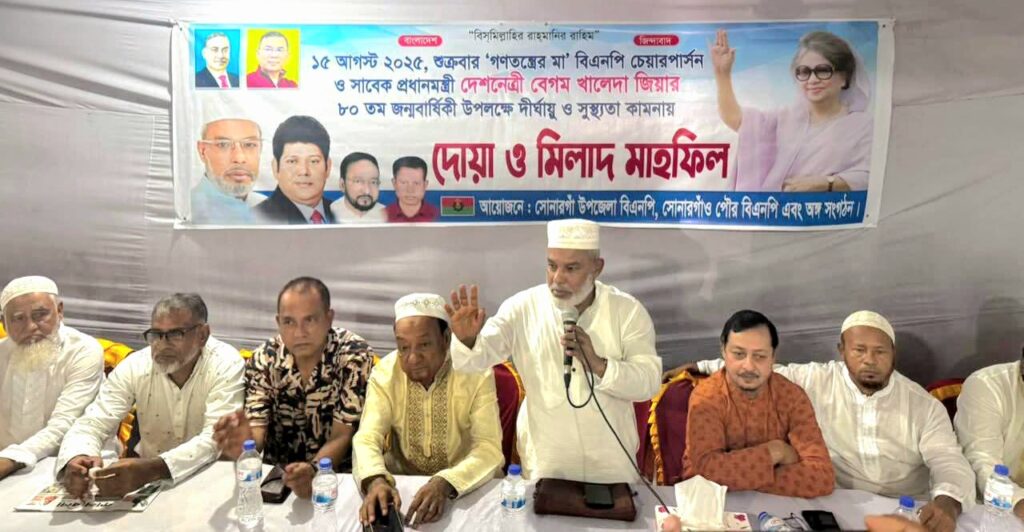 নিউজ সোনারগাঁ: নারায়ণগঞ্জের সোনারগাঁয়ে বিএনপি চেয়ারপার্সন ও সাবেক প্রধানমন্ত্রী ‘গণতন্ত্রের মা’ দেশনেত্রী বেগম খালেদা জিয়ার ৮০তম জন্মদিন উপলক্ষে তাঁর সুস্থতা ও দীর্ঘায়ু কামনায় দোয়া ও মিলাদ মাহফিল অনুষ্ঠিত হয়েছে।